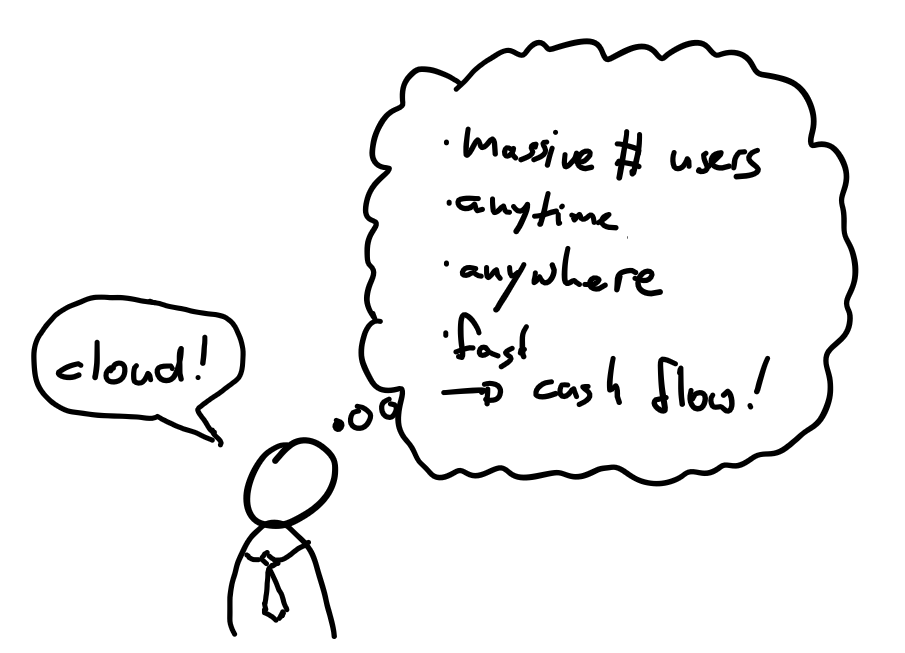 Now, let’s switch to our third perspective: The software architects and/or engineers who are tasked to build the server side of fancyApp. It is likely that their manager tells them only what he has been told: “build it in the cloud“. They are unaware of the thoughts and expectations that come along with it.